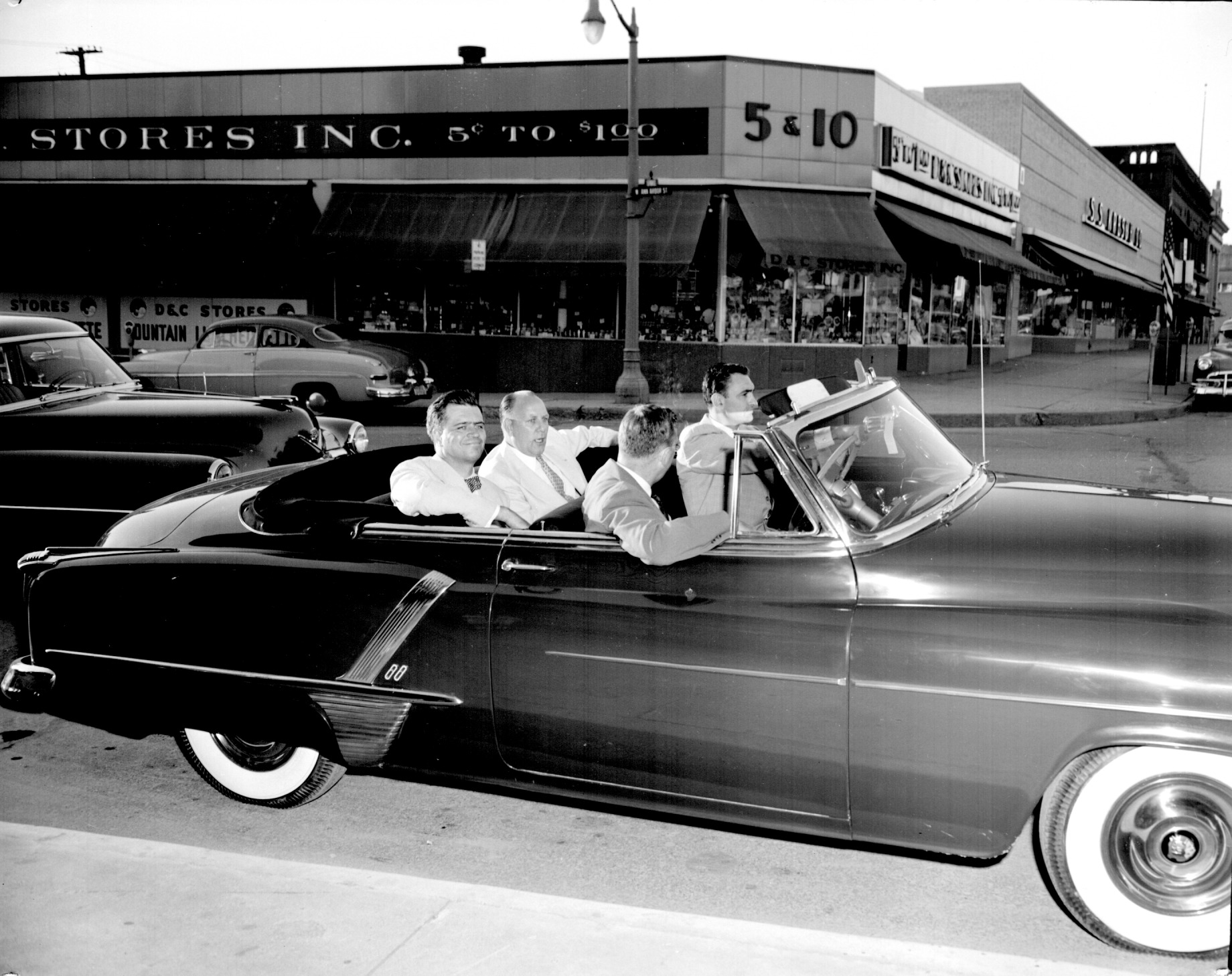 Photo of Governor G. Mennen Williams riding in the back seat of a convertible during the annual 4th of July parade in Plymouth, 1952. The automobile is traveling east on Ann Arbor Trail at the intersection of Main Street.