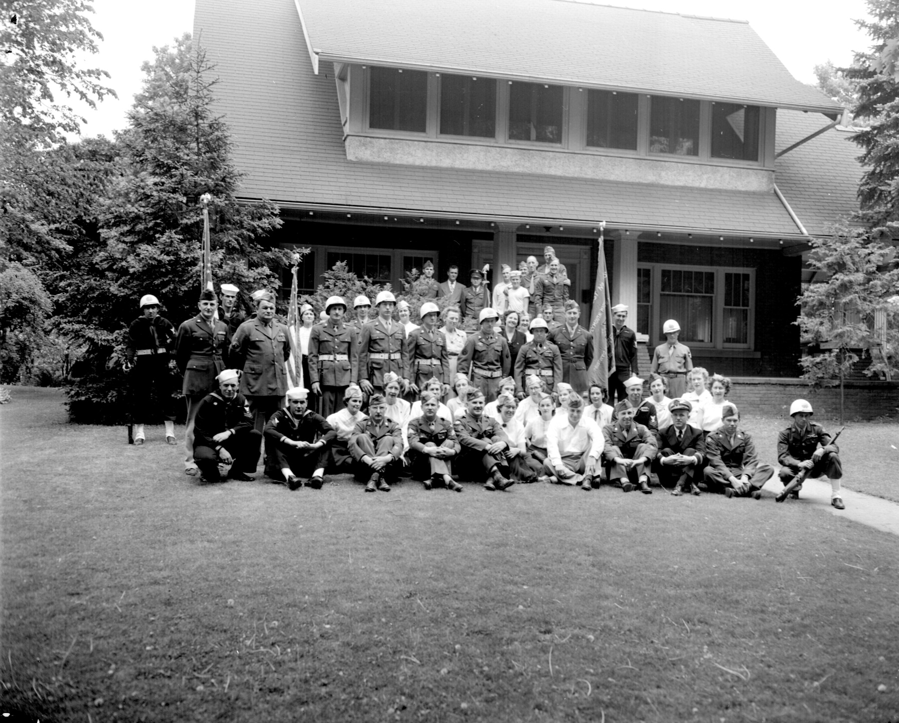 Photo of VFW Veterans in front of Mariette Hough Memorial Building after the July 4th Parade, 1950. This building, located at 173 N. Main Street, was dedicated to the use of service clubs.