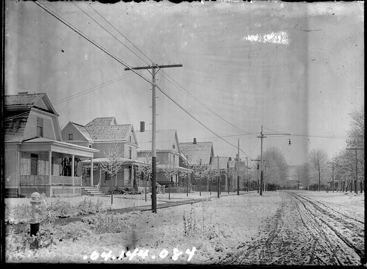 Glass plate negative showing a winter street scene in Plymouth (Michigan)