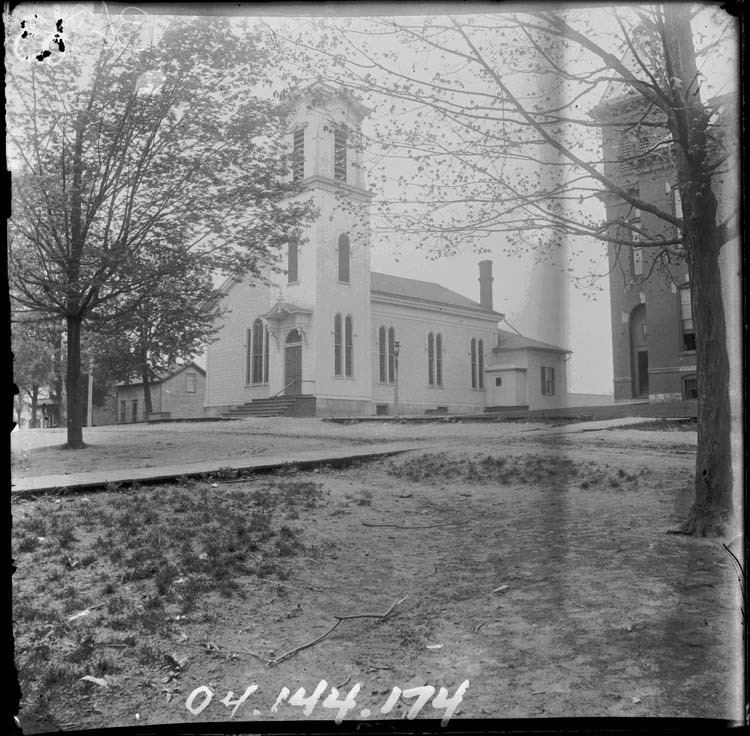 Glass plate negative of the Methodist Episcopal Church prior to 1907. The church as built in 1848; renovated in 1874, and burned in 1916 along with Plymouth High School.