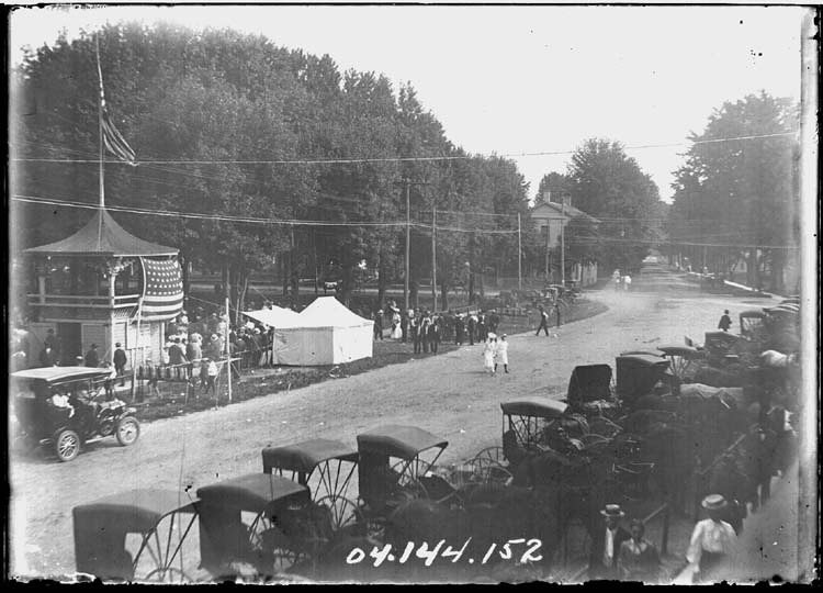 Glass plate negative shows Main Street looking south toward Ann Arbor Trail. The bandstand in Kellogg Park was torn down in the early 1920s.
