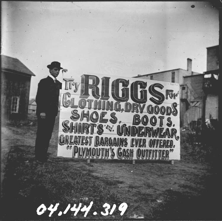 Photograph of a man holding a large sign advertising Riggs Store, "Plymouth's Cash Outfitter." The E.L. Riggs Store was located on Main Street.
