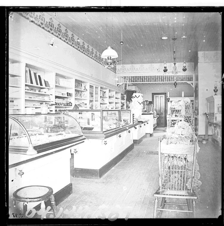Glass plate negative showing the interior of a local store with displays and shelves.