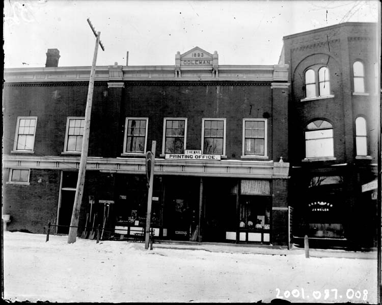 Photograph of the business district on Sutton Street showing the Coleman Building, built in 1893. This building fronted on Main Street and extended around the corner to Sutton Street (now Penniman Avenue.) Also seen are the Plymouth Mail newspaper building and the C.G. Draper Store.