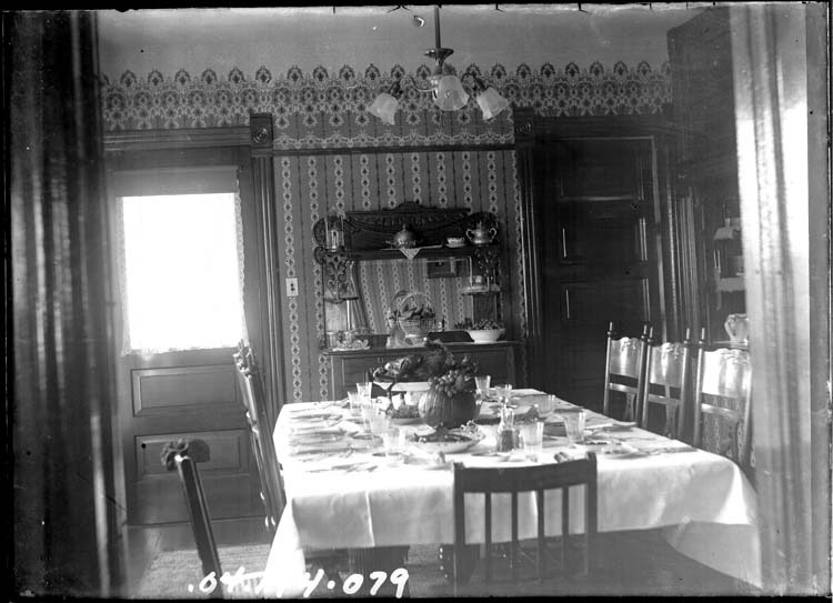 Glass plate negative of the interior of the Charles Draper house in Plymouth showing the dining room with the table set for dinner, possibly Thanksgiving. Note the turkey on the table along with the pumpkin decorations.
