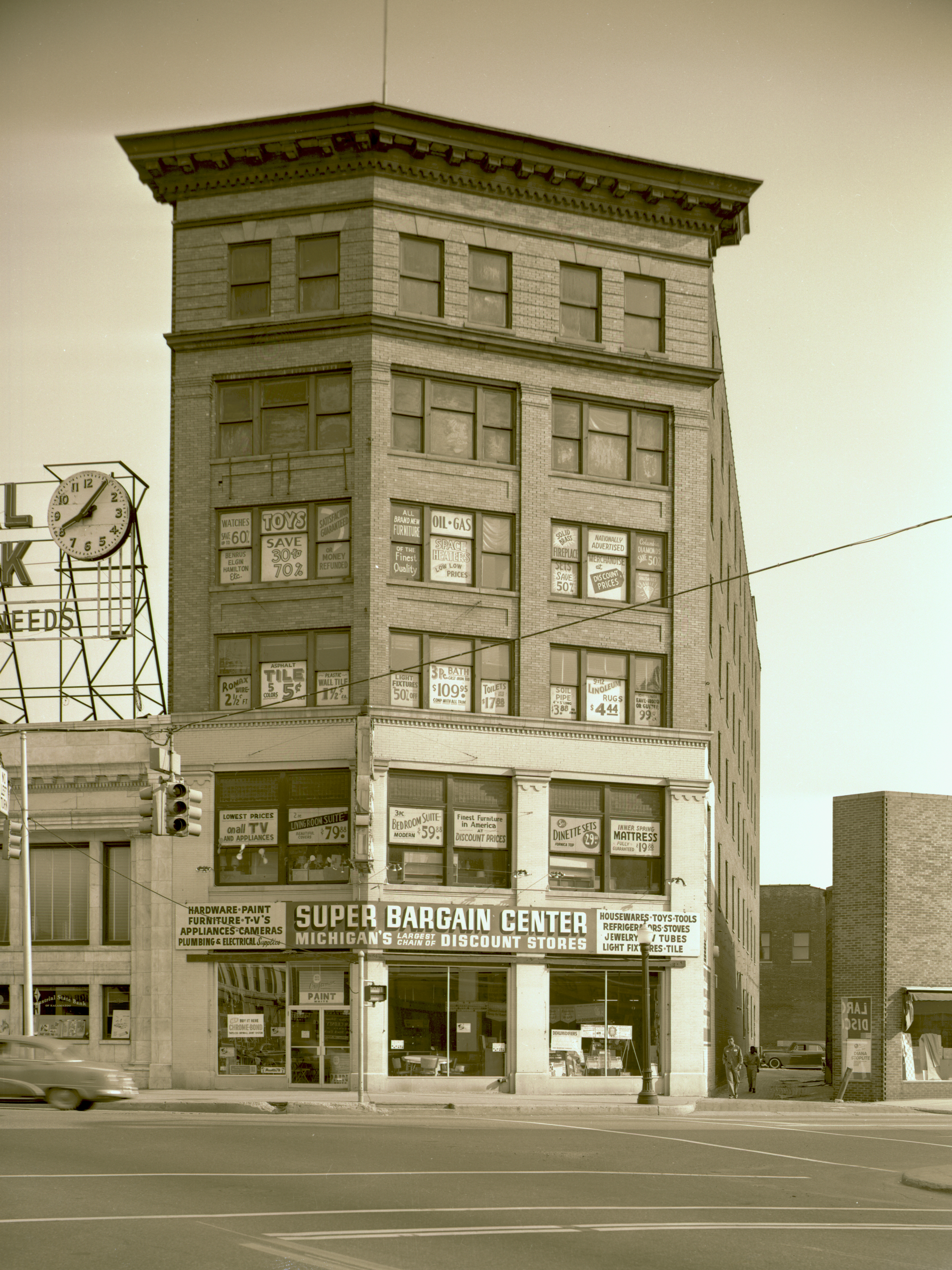 Black and white negative showing the front facade of the Super Bargain Center (former Sears and Roebuck) located at 161 East Michigan Avenue in downtown Kalamazoo, Michigan. The building stands on the north side of the street with the camera facing almost due north. East Michigan Avenue can be seen running from left to right in the foreground of this June 27th, 1961 image. Visible to the right is the Industrial State Bank located at 151 East Michigan Avenue. As of 2004 this building has undergone a major restoration and now houses new tenants.