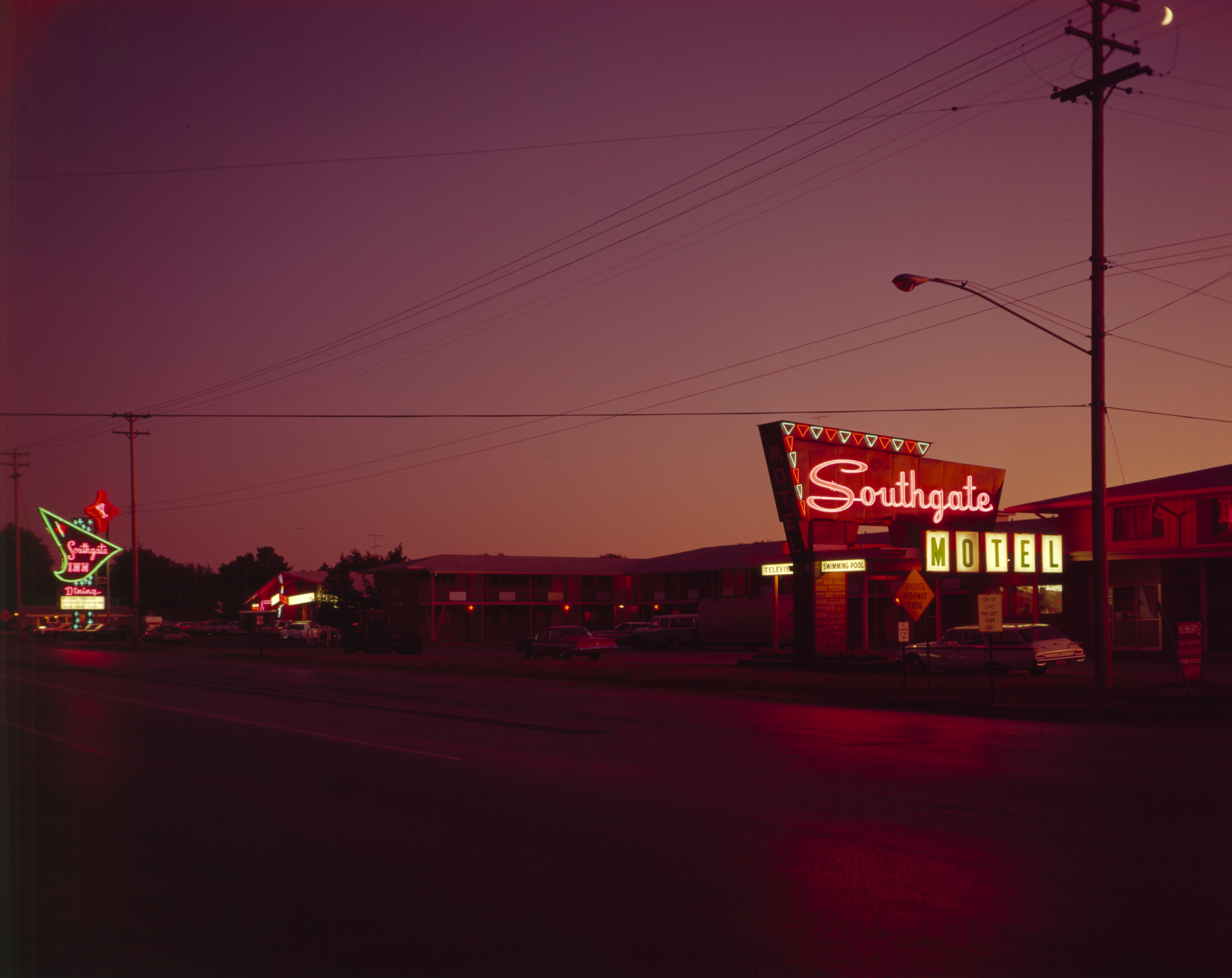 Color negative of the Southgate Motel and Inn located at 5630 South Westnedge in Portage, Michigan. This c.1963 image is looking southwest down South Westnedge Avenue and was taken just south of the Interstate 94 or (I 94) overpass. As of 2004 this motel and restaurant have been demolished and the sight is awaiting new development.