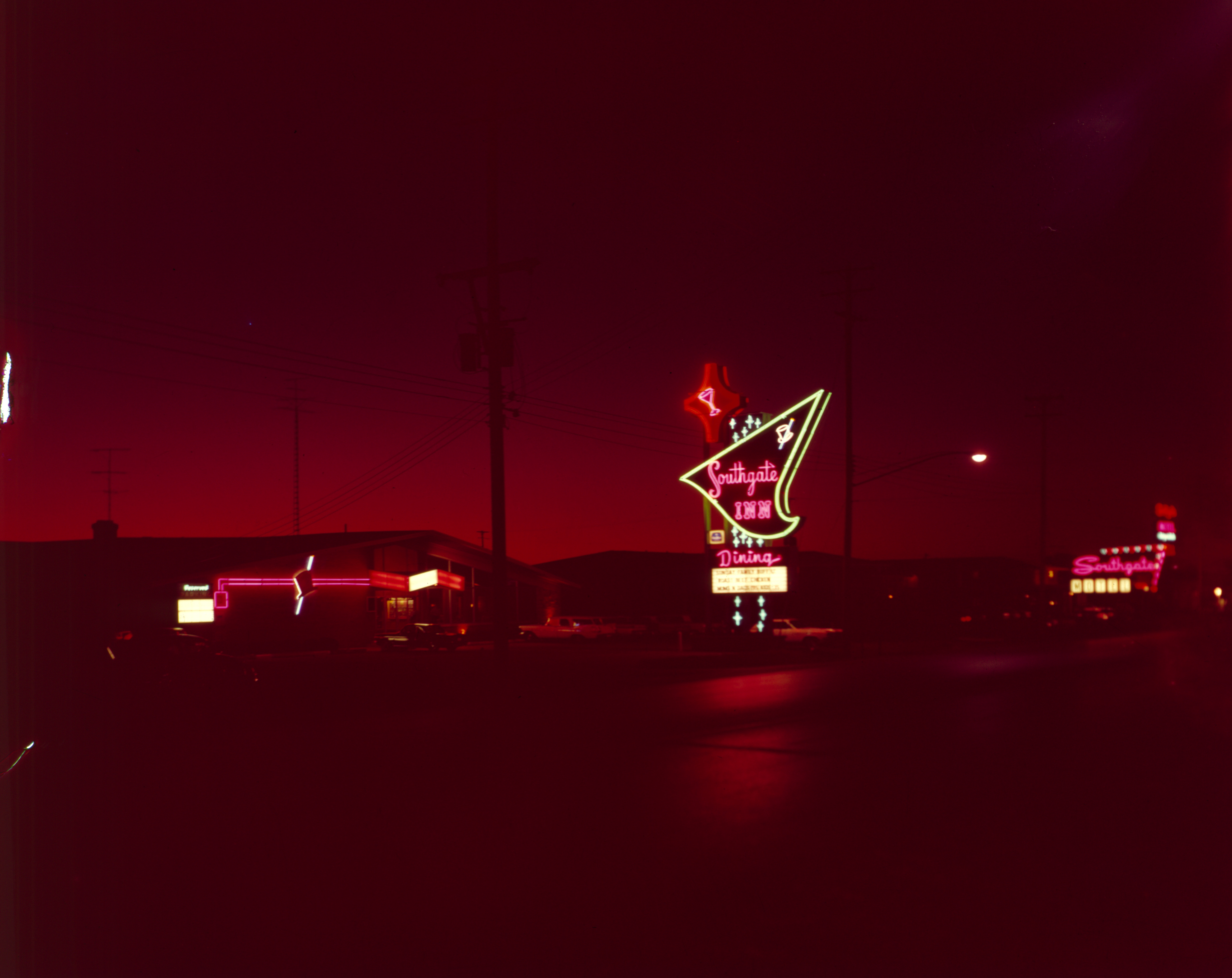 Color negative of the Southgate Motel and Inn located at 5630 South Westndege Avenue in Portage, Michigan. The camera is looking northwest up Westnedge Avenue showing the neon Southgate Inn sign in the foreground and the neon Southgate Motel sign in the background. As of 2004, both of these structures have been demolished and the sight left vacant awaiting further development.