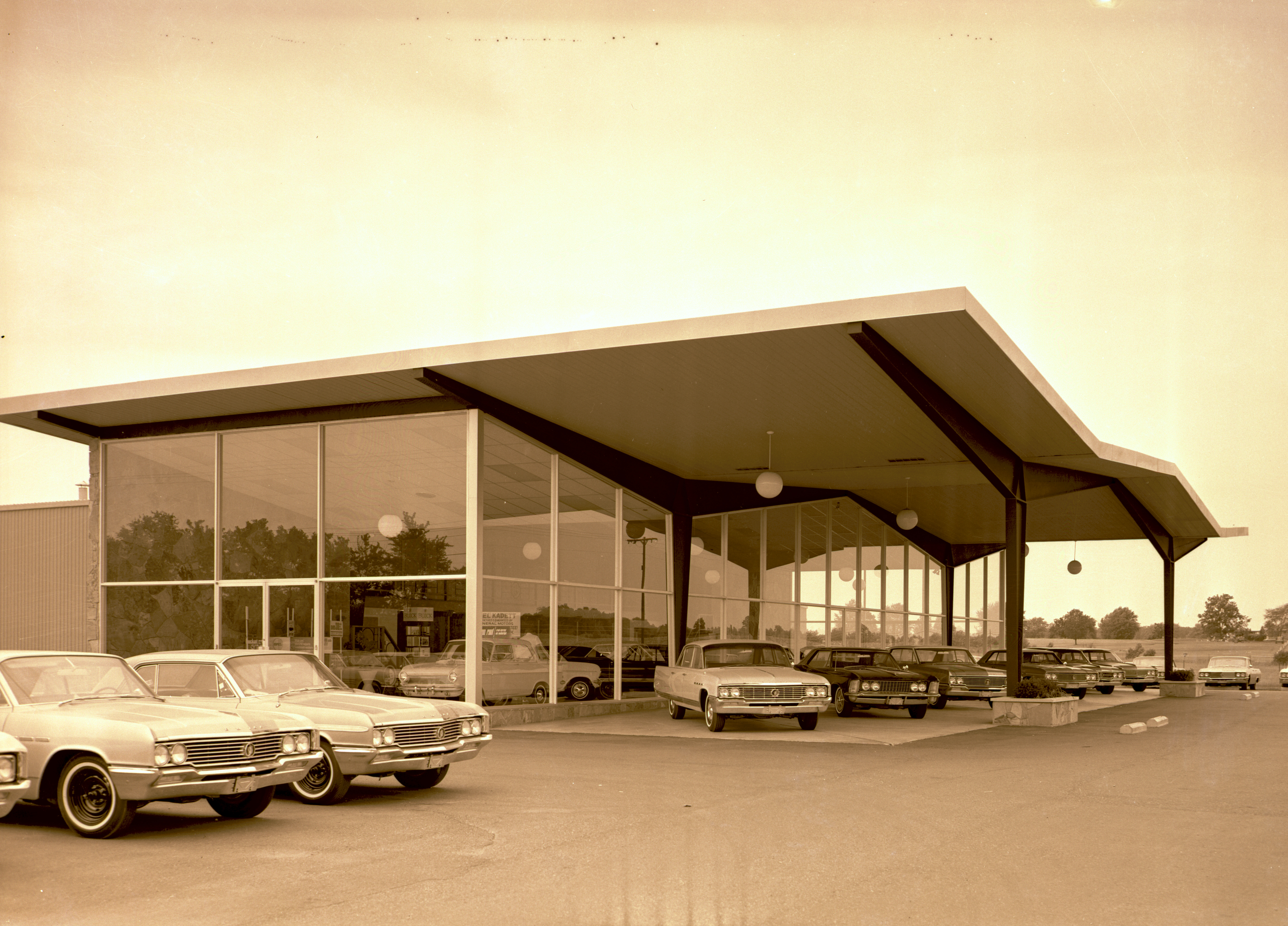Black and white close-up of the exterior facade of Boylan Buick located at 5047 West Main Street in Kalamazoo, Michigan. It should be noted that in the showroom among the new Buicks is visible a Opel Kadett which this dealership also offered. The image is looking to the southwest and was taken in 1964. As of 2005 this business has been replaced with a strip mall.