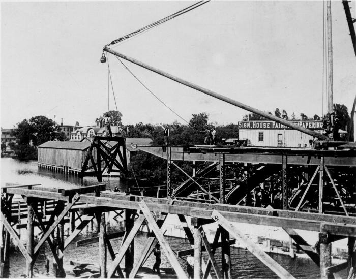 Photo of construction of concrete Michigan Avenue Bridge over the Grand River, 1893-1894. Looking northeast toward Lakeshore RR depot.