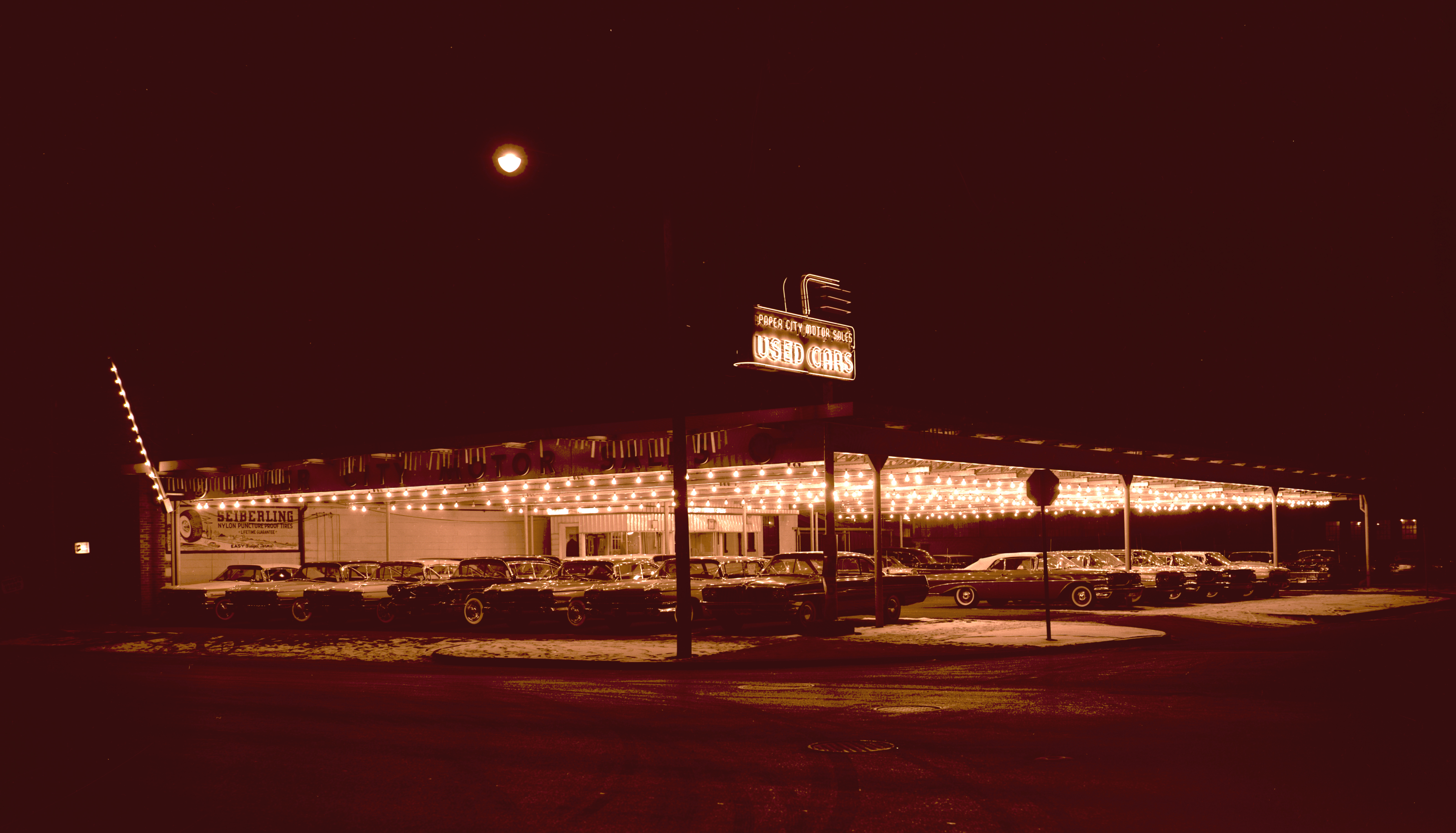 Black and white image of the exterior facade of the Paper City Motors-Used Car Division located on the west side of Kalamazoo Avenue between South Westnedge Avenue and Elm Street. The address for the Used Car Division is 417 West Kalamazoo Avenue Kalamazoo, Michigan. As of 2005 the building remains standing but has since been converted for alternative use.