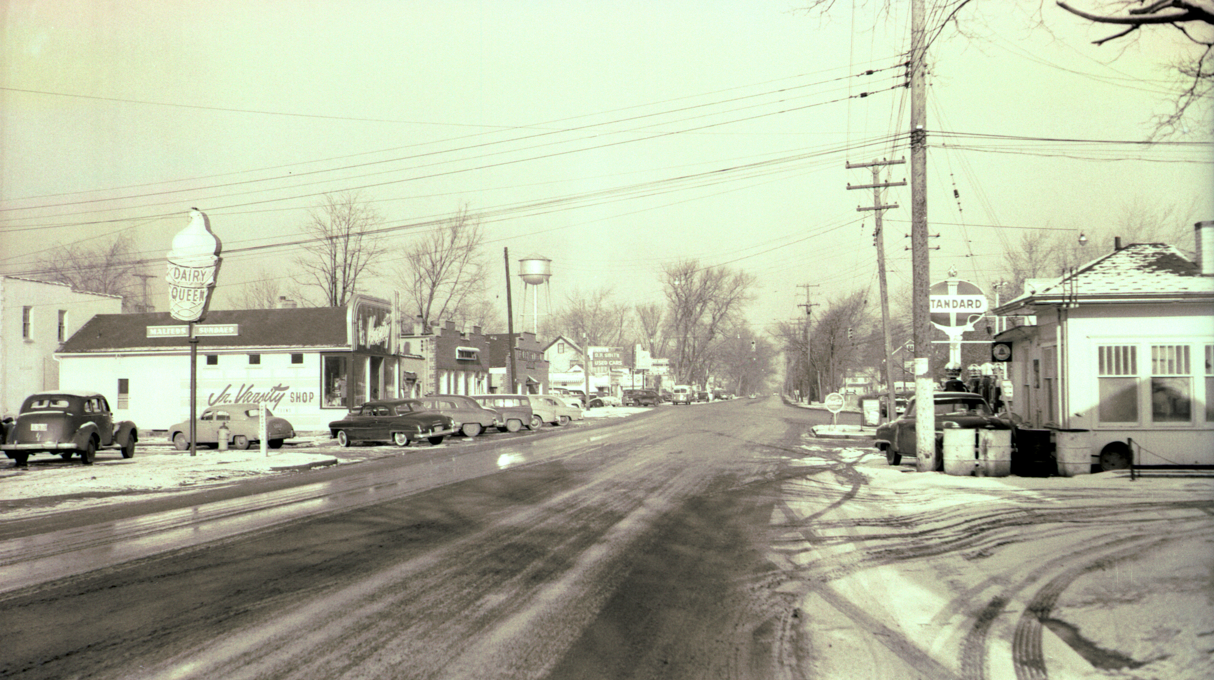 Black and white negative looking north up Lovers Lane towards its juncture with Portage Street in Portage, Michigan. The photographer is standing just to the north of the Cork Street, Lovers Lane intersection. Some of the businesses in view are: RIGHT SIDE-Barnes Oil Company Filling Station (Standard) at 3036 Portage Street. LEFT SIDE-Dairy Queen at 3002 Lovers Lane and Jr. Varsity Shop at 2926 Portage Street.