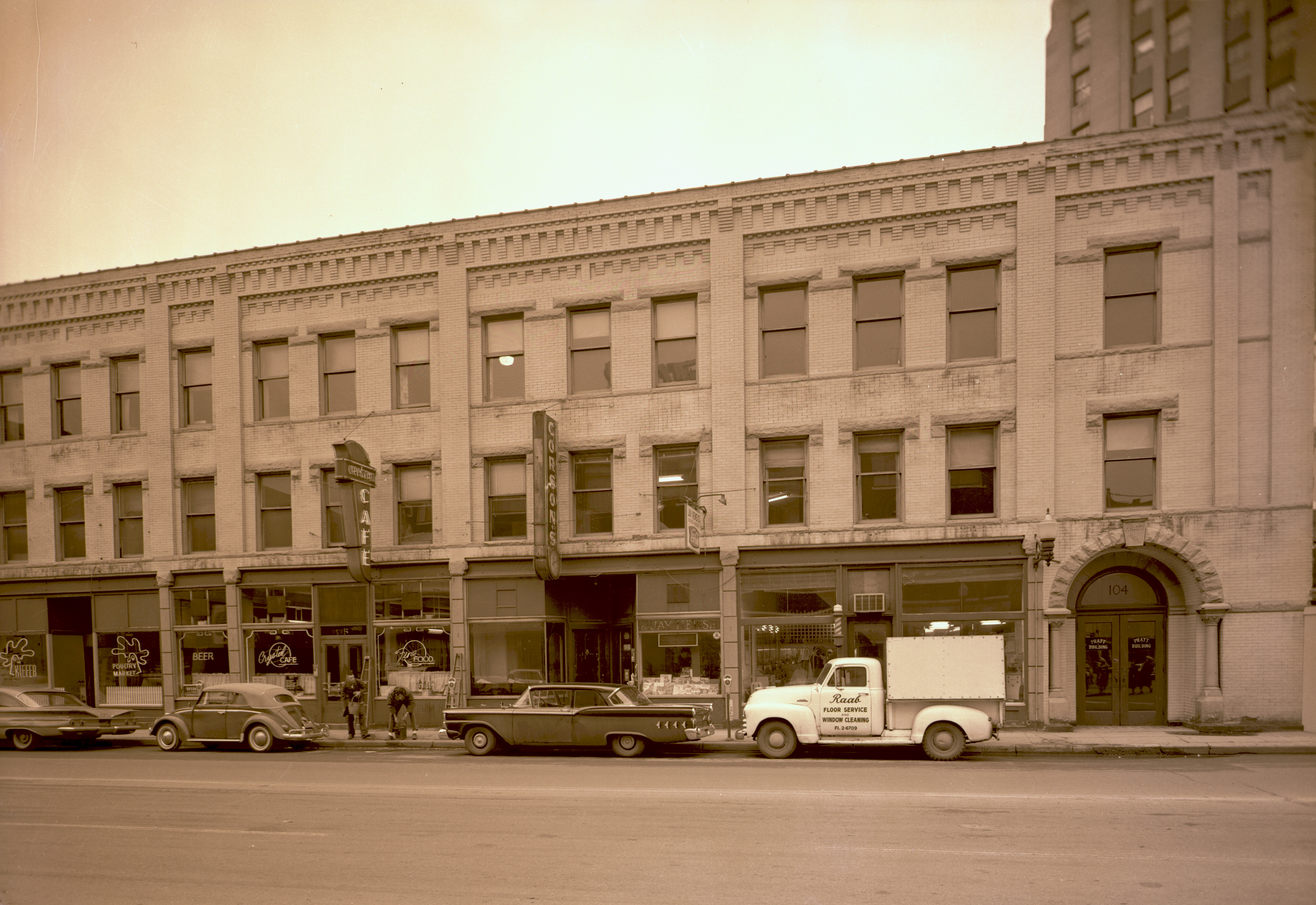Black and white negative of businesses located on the west side of Portage Street just to the south of Michigan Avenue in downtown Kalamazoo, Michigan. The businesses shown are (from left to right): Keifer Farms Poultry Market-120 Portage Street, Crystal Cafe Restaurant-116 Portage Street, Corson's Jewelry-112 Portage Street, Jay News Company-110 Portage Street and Rice Arlyn Barber Shop-108 Portage Street. The Pratt Building at 102-104 Portage Street can be seen to the right and a truck for RAAB Floor Service and Window Cleaning is parked along the street with the window washers working on the Crystal Cafe.