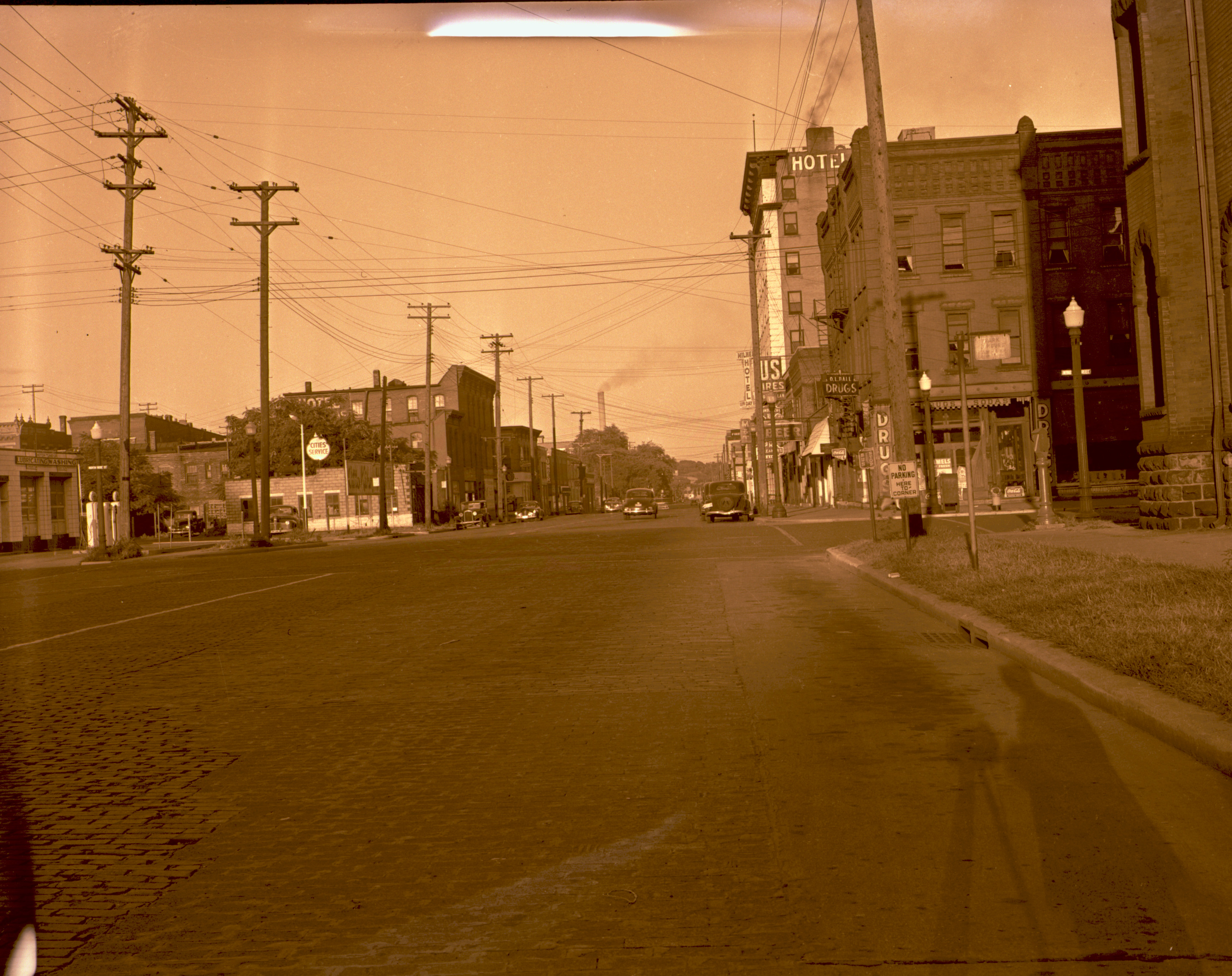 Black and white negative looking east down Kalamazoo Avenue just west of the Kalamazoo Avenue and Rose Street intersection in downtown Kalamazoo, Michigan. The businesses along both sides of Kalamazoo Avenue are visible including Ora L. Ball Drugs, 346 North Rose, on the southeast corner of Kalamazoo Avenue and North Rose Street and Cities Service Station, 414 North Rose, on the northeast corner of Kalamazoo Avenue and North Rose Street.