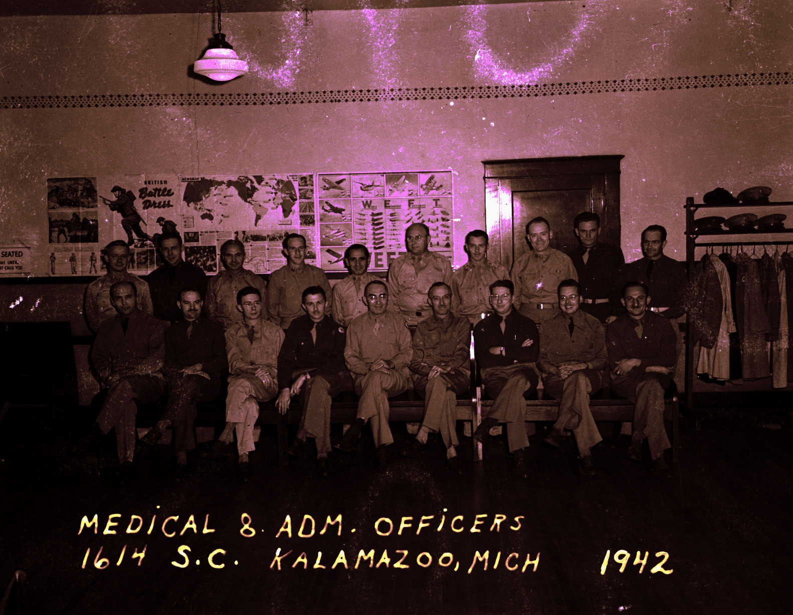 Black and white negative of nineteen men in posed in a semi-formal photograph. The front row is seated while the rear row remains standing. On the wall behind them are various military posters while the coat rack on the right sports military jackets and visor officers caps. The men appear to be wearing various military uniforms.