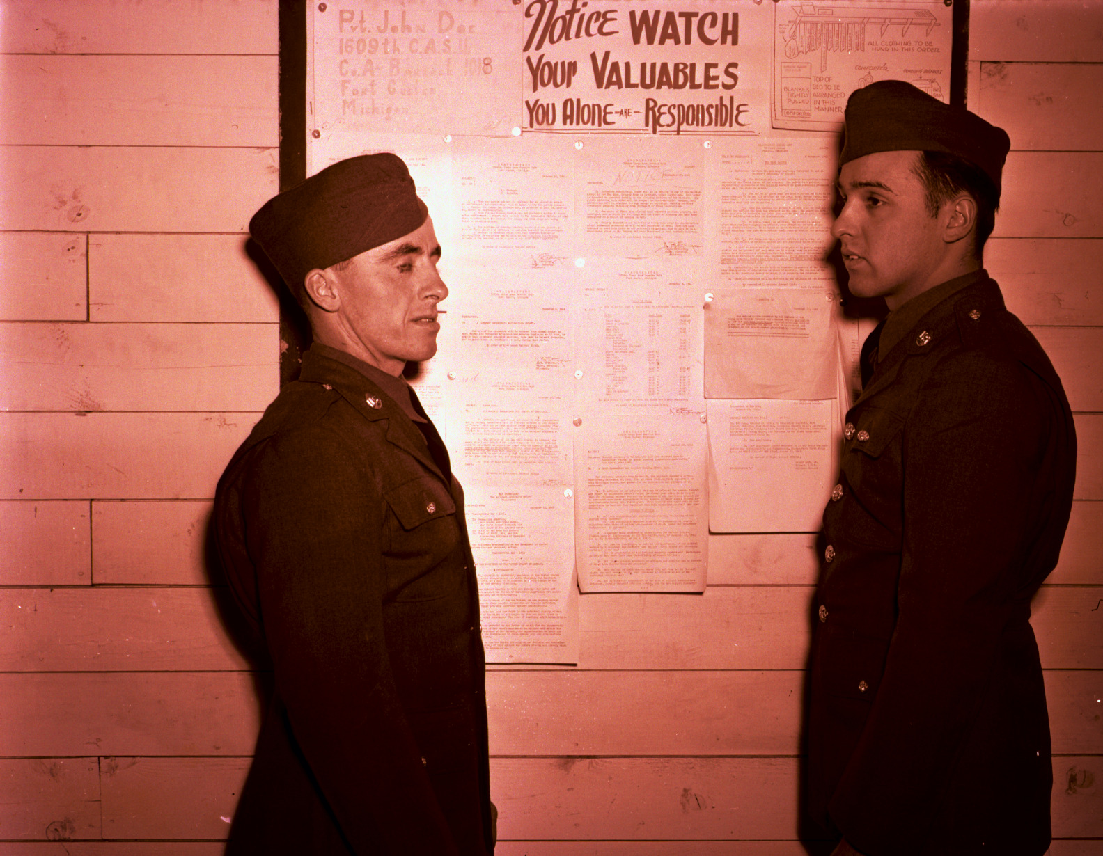 Black and white negative of two men wearing United States Army Class A uniforms standing outside a barracks building at Fort Custer in Battle Creek, Michigan on the eve of World War II (1941-1945). Behind them is a bulletin board with various announcements pinned to it. A slip of paper accompanying the image identifies the two soldiers as Earl White of Wayne, Michigan and Bill Yukich of Chelsea, Michigan.