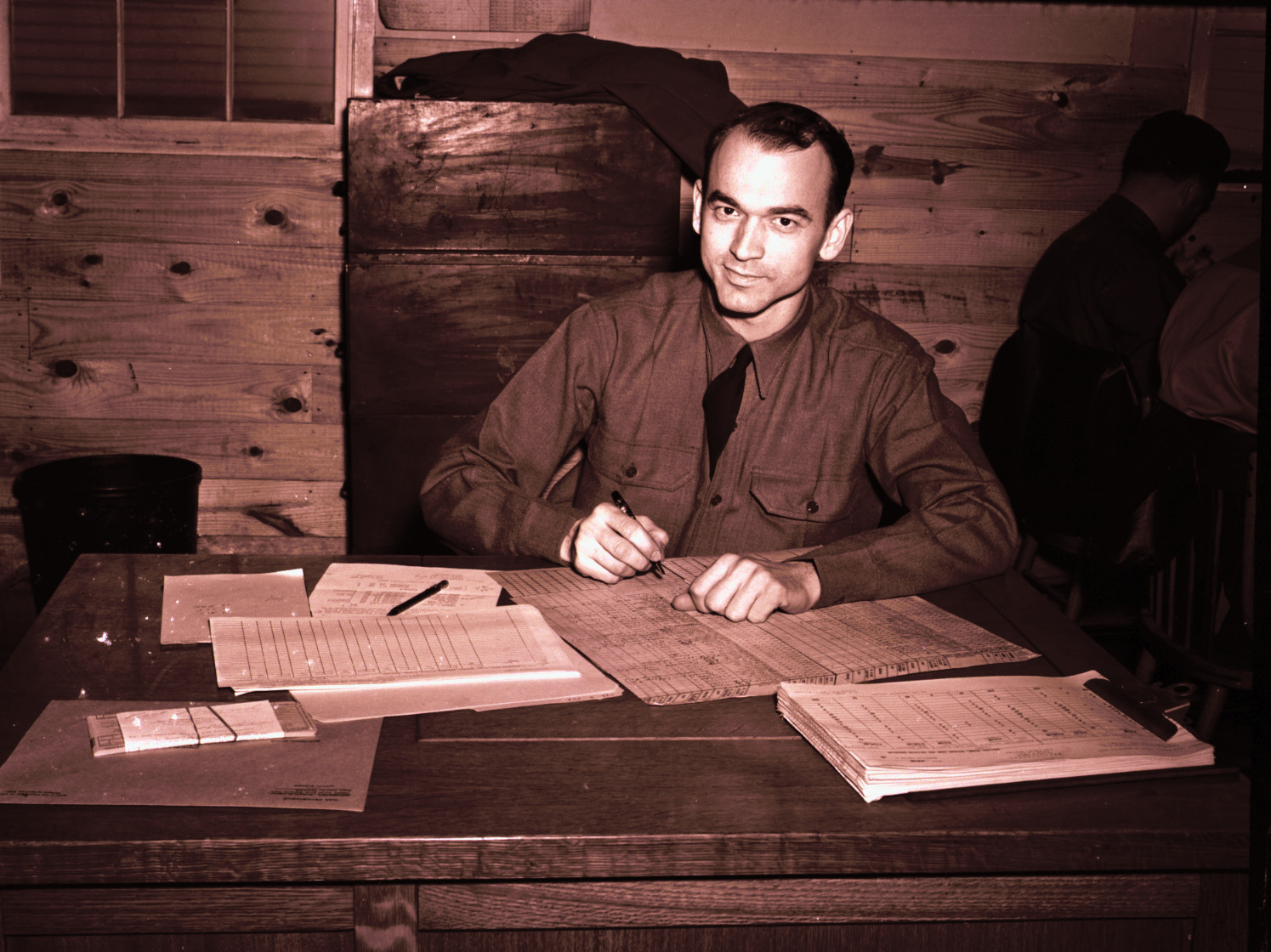 Black and white image of an unidentified soldier of the United States Army seated behind a desk in a base office building located at Fort Custer, Battle Creek, Michigan.