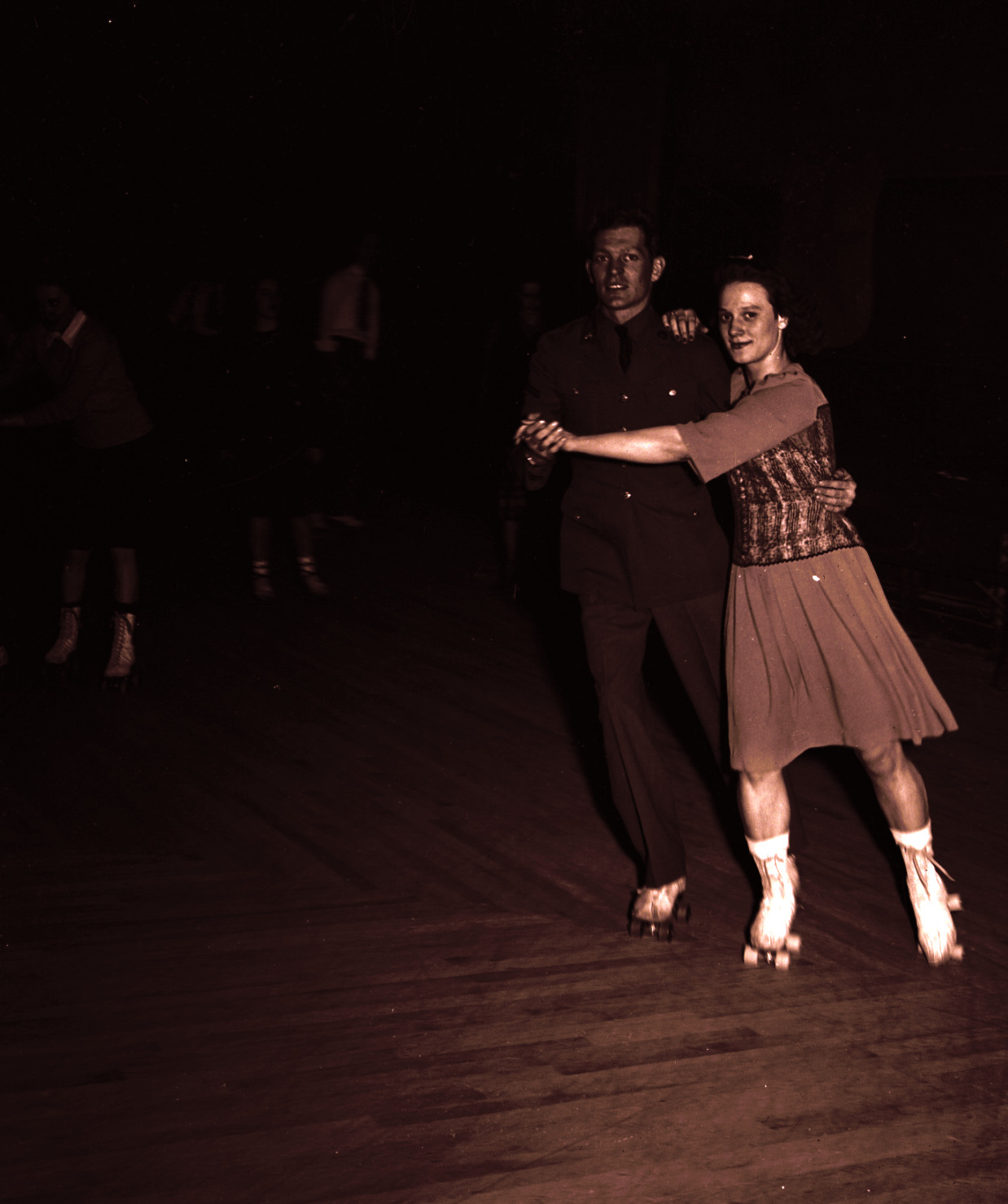 Black and white negative of a young couple skating at the Silver Star Skate Rink located at 141 Portage Street in downtown Kalamazoo, Michigan. The man, identified as Virgel Cheney is wearing a United States Army Class A Uniform while the woman, identified as T. Cline, is wearing a dress.