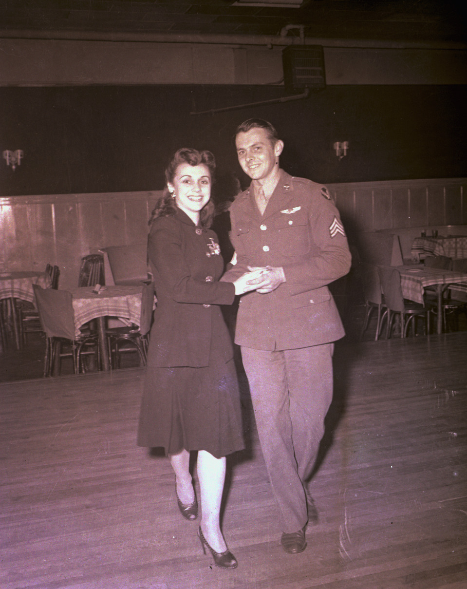 Black and white negative of an unidentified couple on the dance floor of an unidentified Battle Creek restaurant. He is dressed in the United States Army Class A uniform and sports the Army Air Corps shoulder insignia and Sergeant Stripes. He is also wearing Army Air Crew Wings on his left breast. Battle Creek was home to a large United States military installation known as Camp or Fort Custer, hence uniformed service personnel were to be seen in all areas of the city and neighboring cities as well.