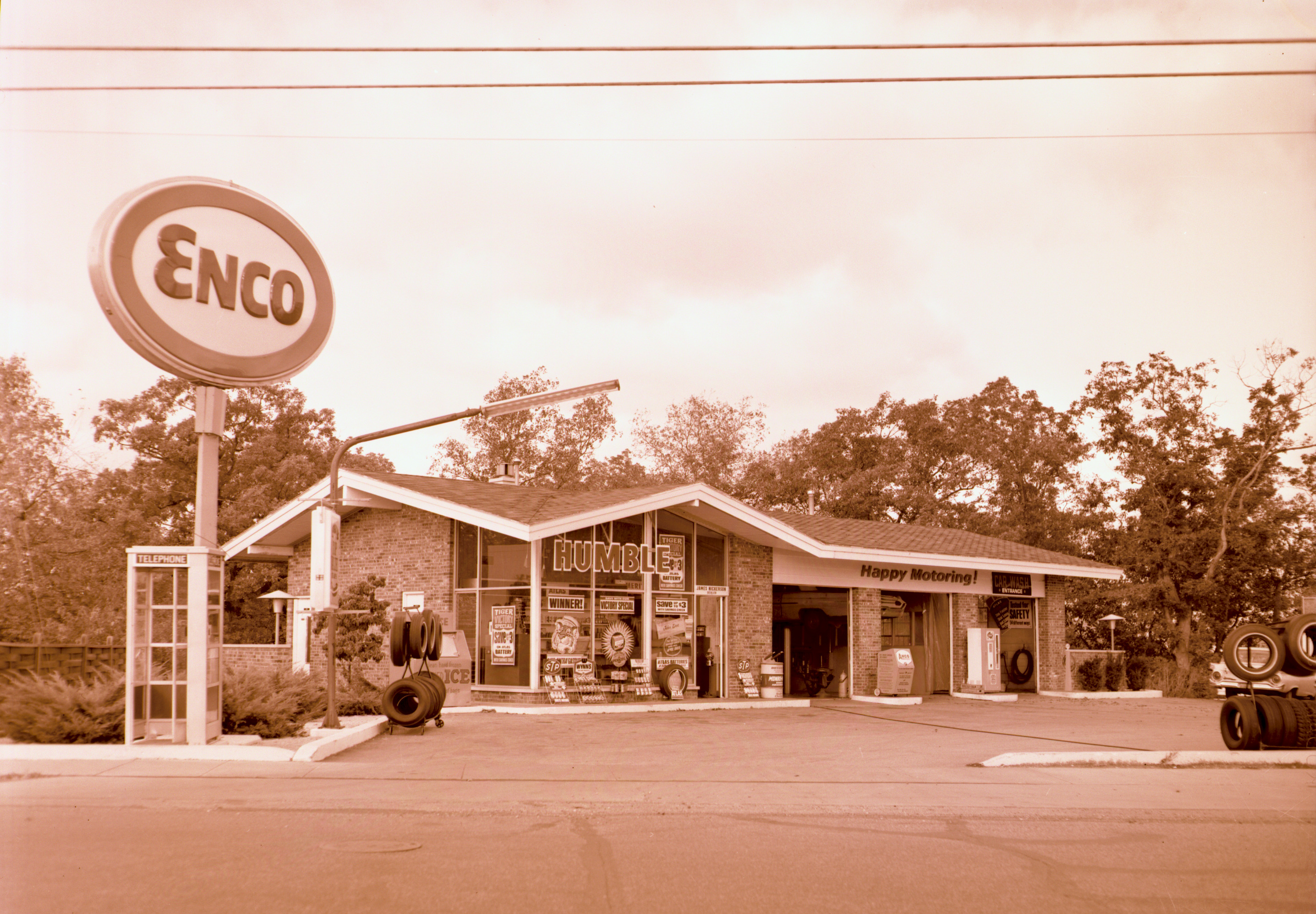 Black and white negative of the Oakwood Enco Service Station located just north of Whites Road at 3050 Oakland Drive in Kalamazoo, Michigan. The image is looking northwest with Oakland Drive running in the foreground, and was taken in October of 1968. As of 2004, this struture has changed little and continues to function as a service station.