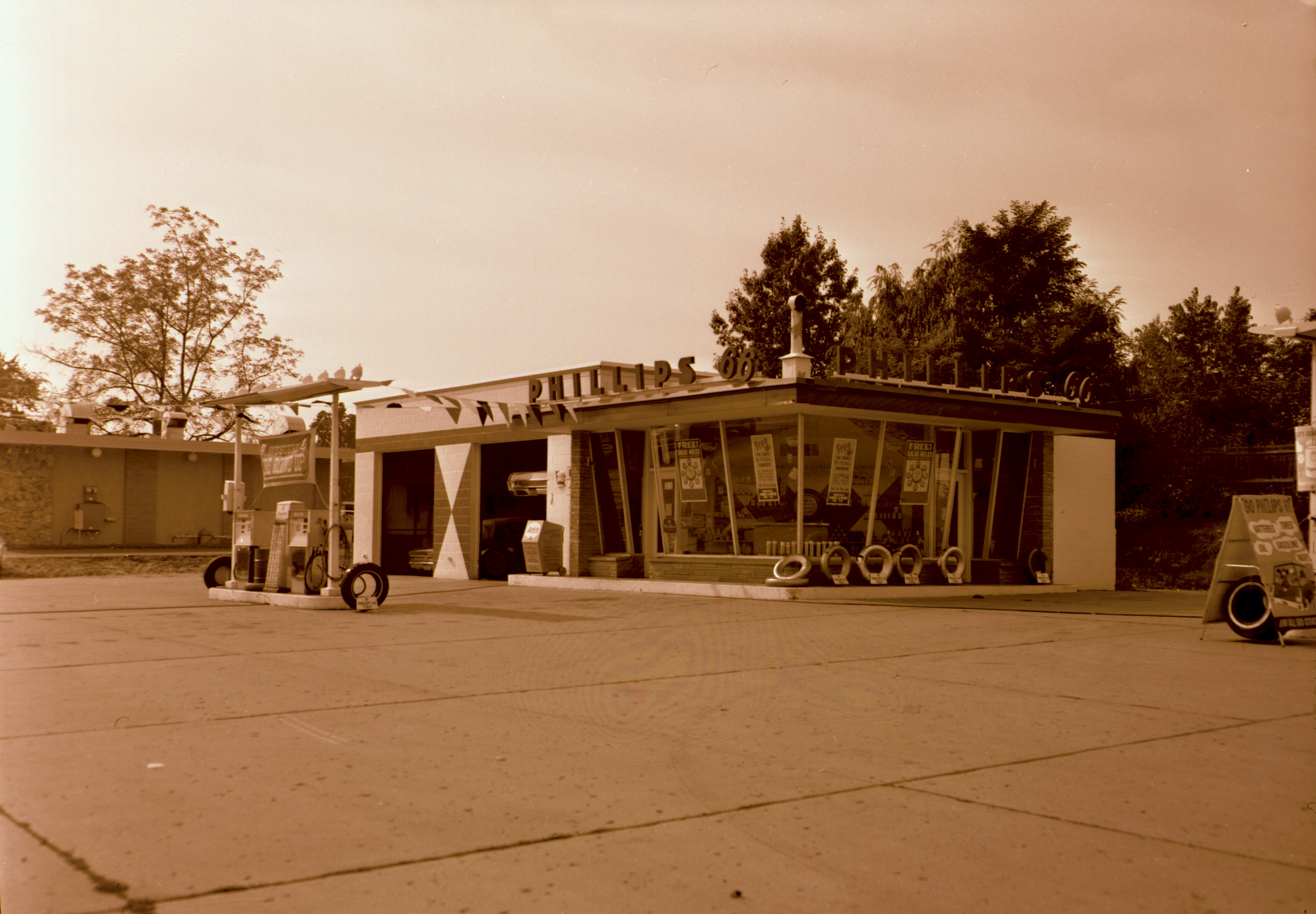 Black and white negative of the Phillips 66 Service Station (also known as Dave's 66) located at 3810 South Westnedge in Kalamazoo, Michigan. The structure stands on the west side of the street with the camera looking to the southwest. As of 2004 this structure has been converted to Mi Ranchito, a popular Mexican restaurant.