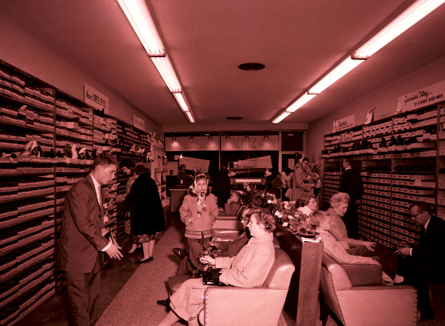 Black and white negative showing the interior of the Cork Lane Shoe Shop located at 1012 East Cork within the Cork Lane Shopping Plaza located on the southwest corner of Cork Street and Lovers Lane in Kalmazoo, MIchigan. The image is looking north through the front of the store with sixteen customers and four clerks present and was taken on October 16th, 1962. As of 2005, the Cork Lane Shoe Shop is still in business in the same location.