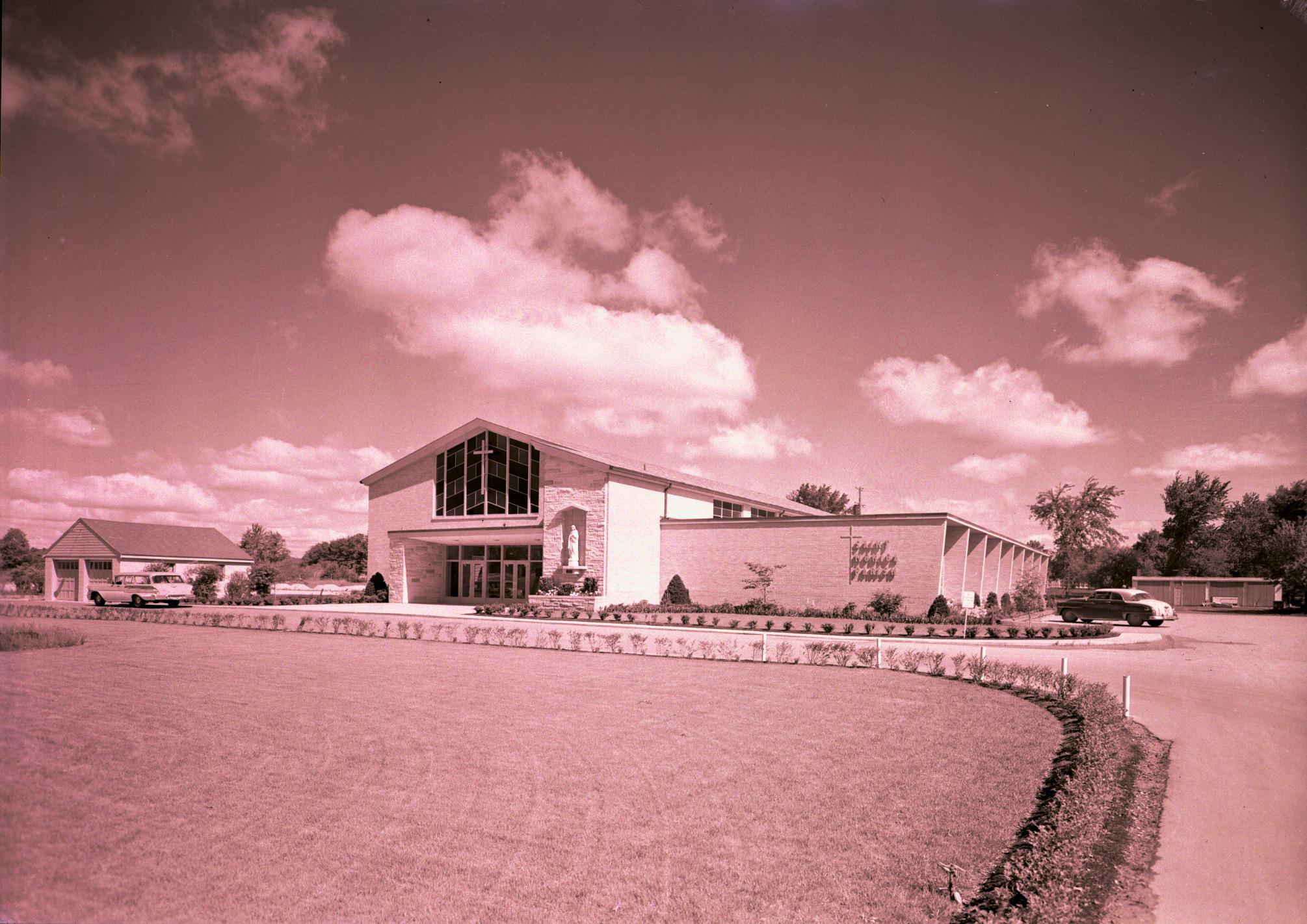 Black and white negative showing Saint Monica's Catholic Church located at 534 West Kilgore Road just to the east of the Kilgore Road and South Westnedge intersection in Kalamazoo, Michigan. It was taken in 1958.