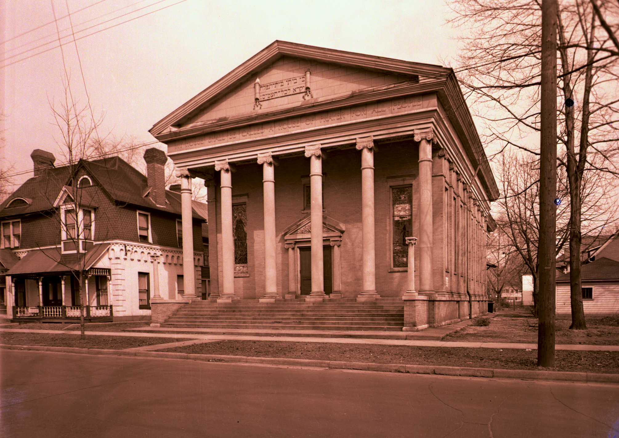 Black and white negative of the exterior facade of 0B'nai Israel's Temple, later the Congregation of Moses located at 619 South Park Street in downtown Kalamazoo, Michigan.