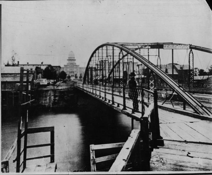 Photograph of Michigan Avenue iron bridge over Grand River, Lansing. Erected 1871.