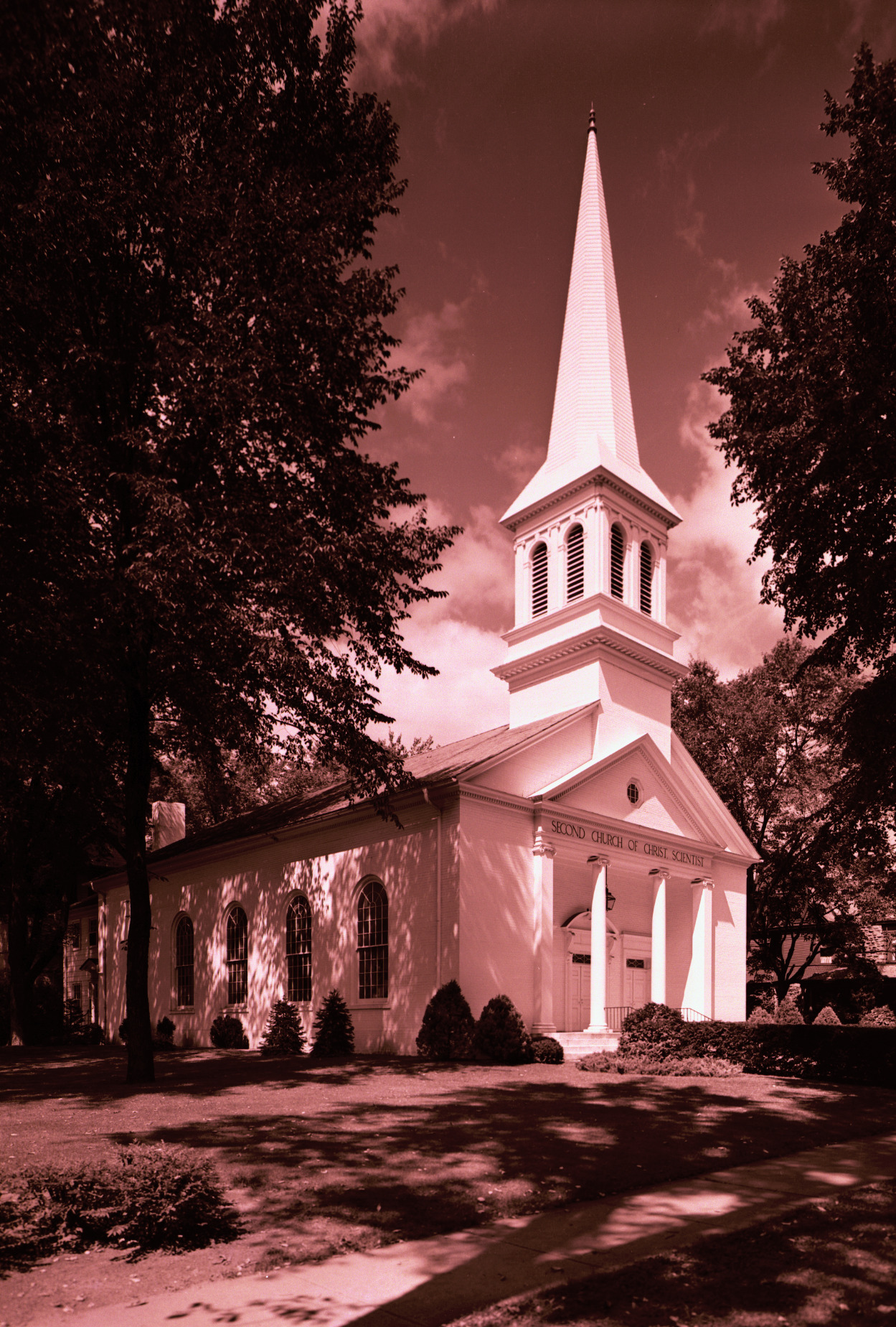 Black and white negative showing the exterior facade of the Second Church of Christ Scientist which is located at 109 Woodward Avenue on the northwest corner of Woodward and West Main Street in Kalamazoo, Michigan. As of 2005 this structure is currently vacant.