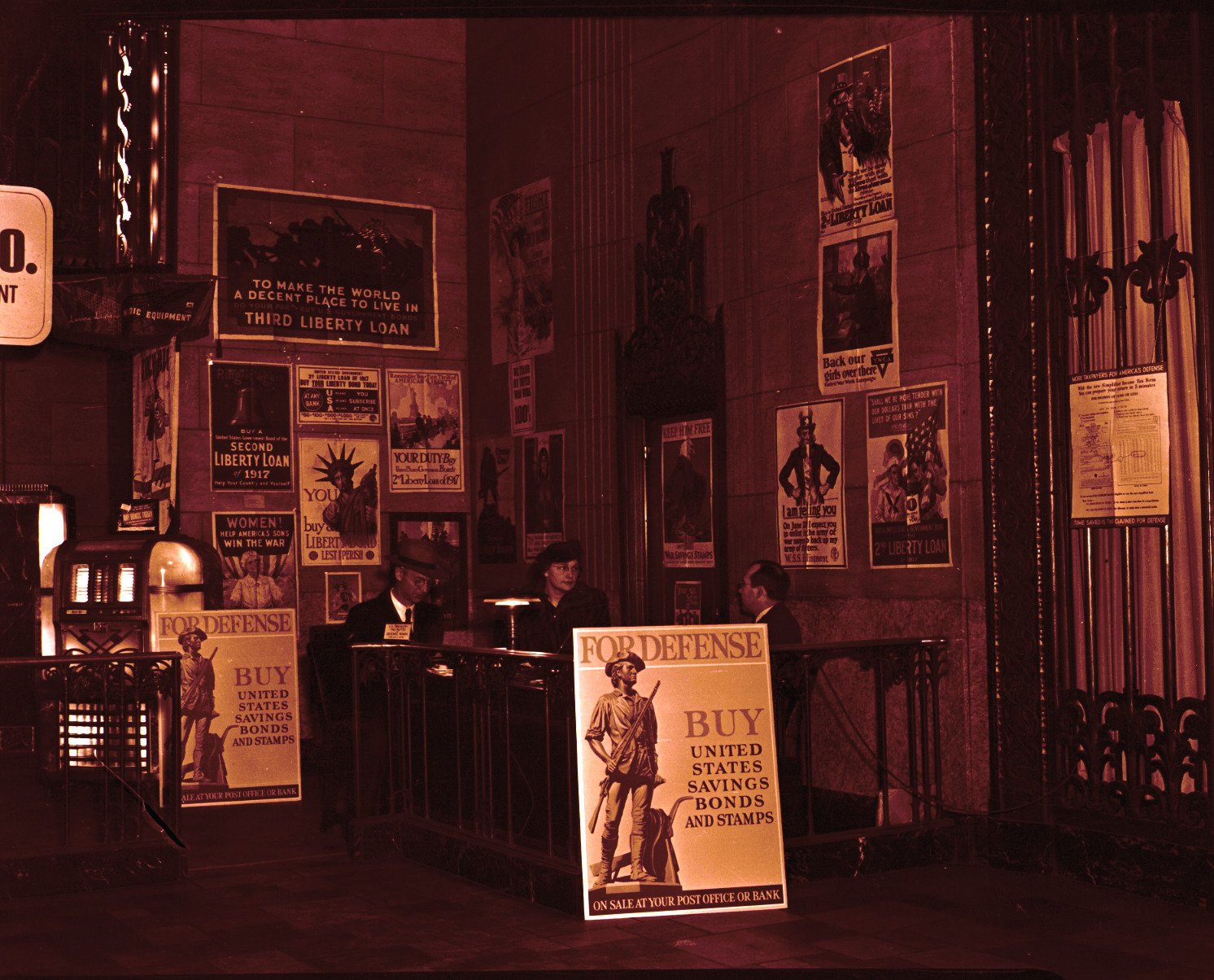 Black and white negative showing a World War II (1941-1945) bond drive occurring in the lobby of the American National Bank and Trust Company located at 136 East Michigan Avenue in downtown Kalamazoo, Michigan. The posters on display are both World War I (1917-1918) and World War II vintage.