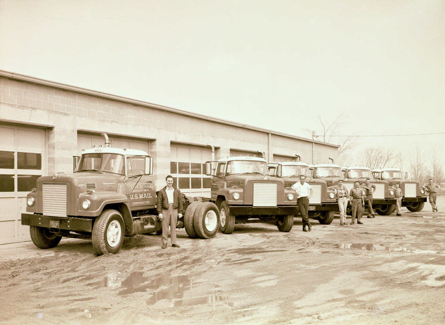 Black and white negative showing the drivers side of six semi-trailer cabs angle parked in front of C & H Truck Leasing Incorporated located at 2532 Saidla Street in Kalamazoo, Michigan.