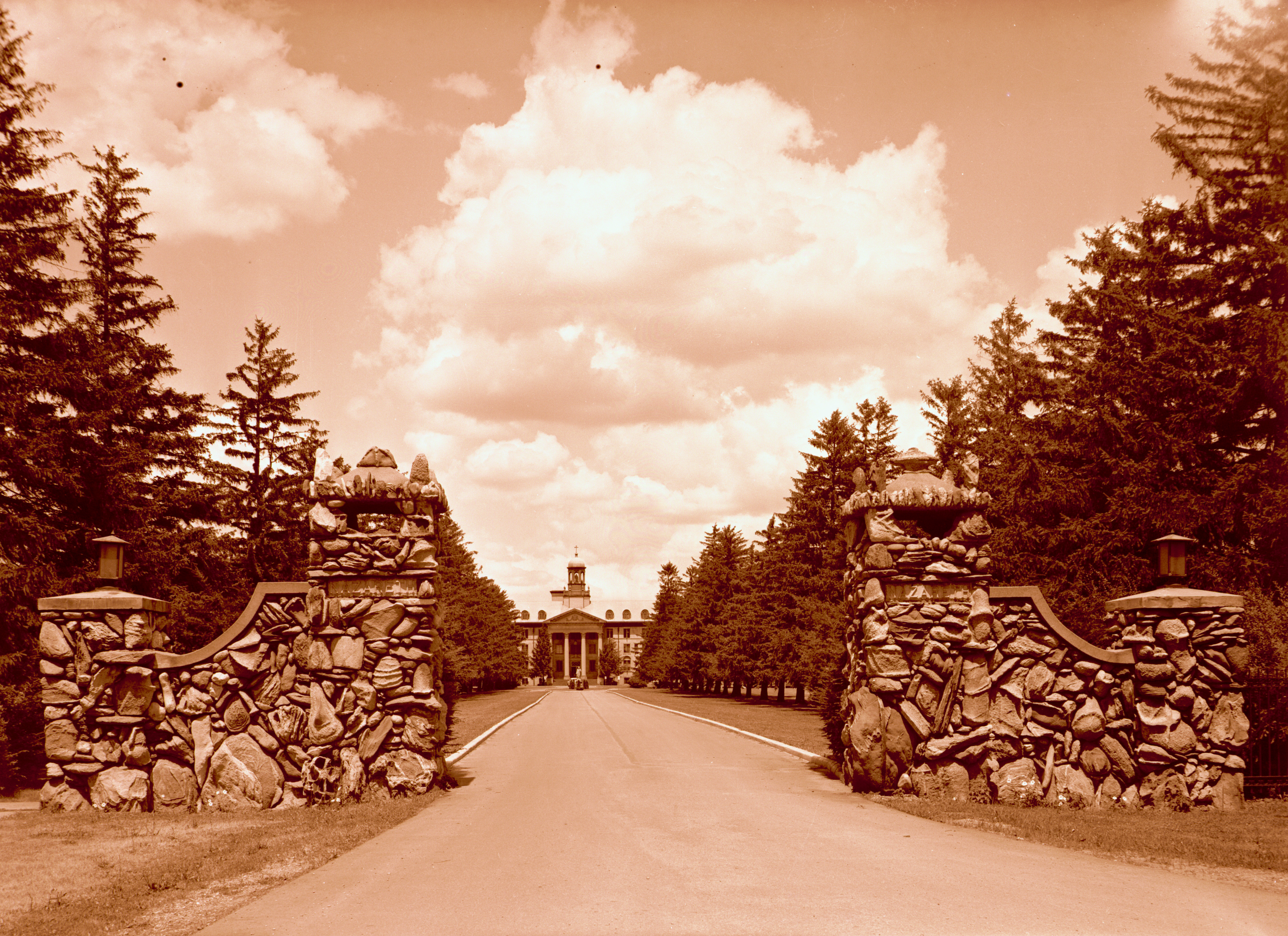 Black and white image of the impressive main entrance to Nazareth College, Sisters of St. Joseph in charge located at 3629 Gull Road in Kalamazoo, Michigan. The main stone entrance gate shows Nazareth carved in the tops of the columns. As of 2005, the college no longer functions however the this main building is still run by the Sisters of St. Joseph and has changed little from this image.
