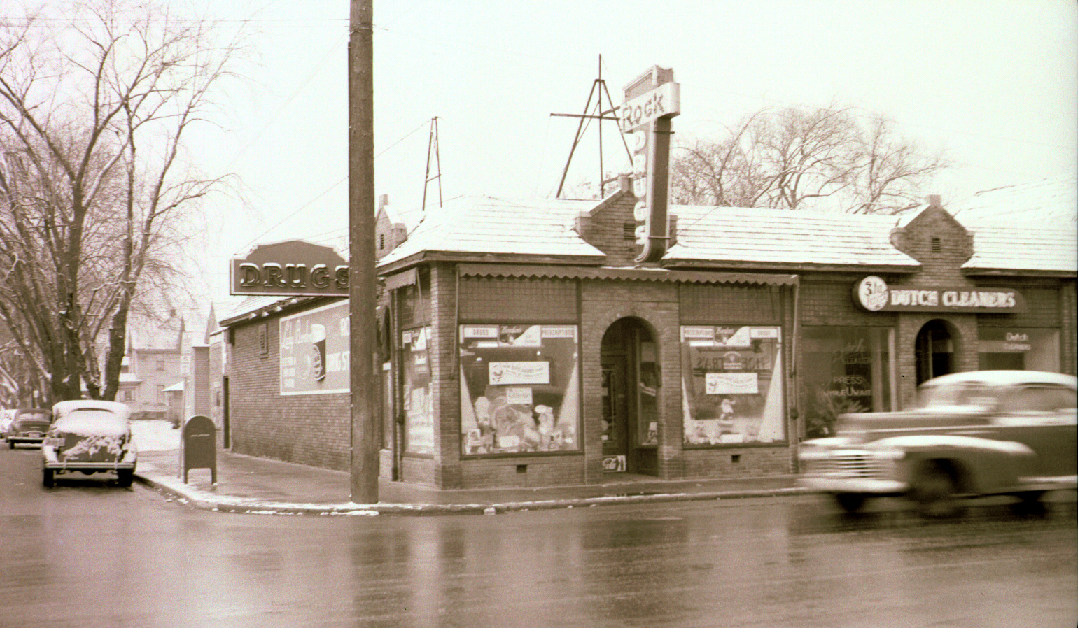 Black and white negative showing Rock Drugs located at 642 Portage Street on the northwest corner of Portage Street and Crosstown Parkway. Next door, located in the same building, is the Dutch Cleaners at 640 Portage Street Kalamazoo, Michigan. This image, which was taken in 1953, is looking northwest with Portage Street running from left to right in the foreground. As of 2004 this structure is still standing, however the occupants have since changed.