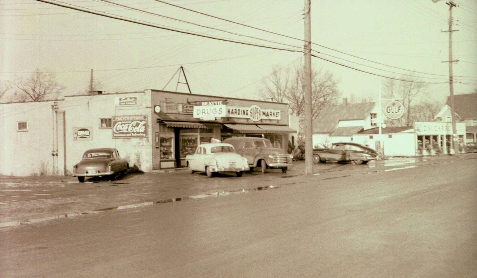 Black and white negative showing the exterior of Beattie's Drug Store located in the Oakwood Neighborhood at 3112 Oakland Drive, in Kalamazoo, Michigan. Harding's Friendly Market, 3110 Oakland Drive, can be seen next door. This image was taken sometime in 1953.