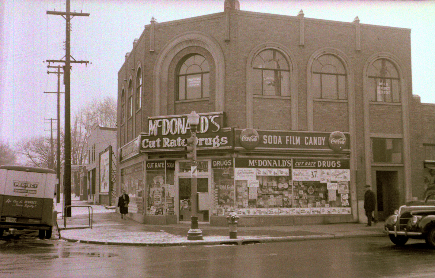 Black and white negative showing George McDonald's Drug Company located within the heart of the Washington Square neighborhood on the southeast corner of Washington Avenue and Portage Street at 1301 Portage Street Kalamazoo, Michigan. This image, which was taken sometime in 1953, looks east with Portage Street running in the foreground. As of 2004 this building still stands however the tennant has changed.