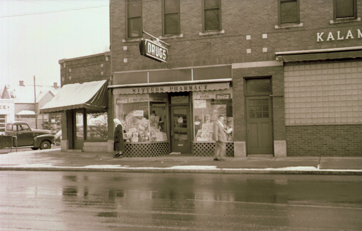 Black and white negative of Witter's Pharmacy located on the southeast corner of Portage Street and Lake Street at 1105 Portage Street in Kalamazoo, Michigan. Next door to the pharmacy, in the same building, is the Kalamazoo Creamery Company at 1111 Portage Street. This image was taken in 1953. As of 2004 this building remains standing, however its facade has been greatly altered.