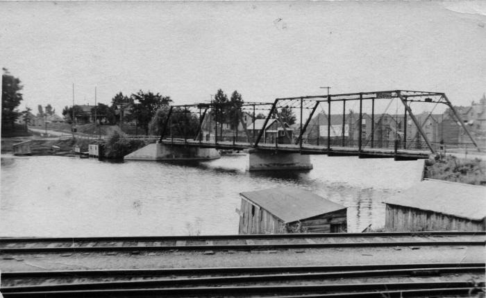Photo of South Logan Street bridge over Grand River, Lansing, Michigan. Several railroad tracks are visible in foreground.