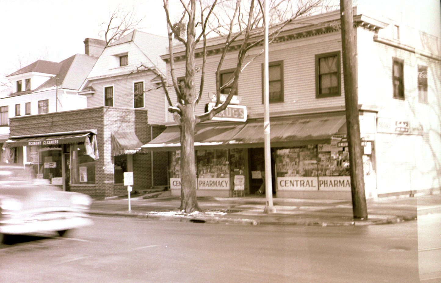 Black and white negative showing the Central Pharmacy located at 819 South Westnedge, on the northeast corner of Ranney and South Westnedge. Next door is the Economy Cleaners Store number one at 817 South Westnedge. This image, which was taken in 1953, is looking northeast with South Westnedge running in the foreground. As of 2004, both of these buildings are still standing however their tennants have since changed.