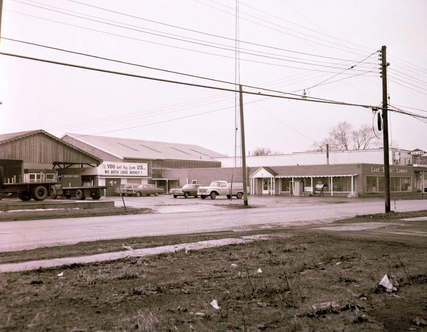 Black and white image of the front facade of Lake Street Lumber located at 1702 Lake Street in Kalamazoo, Michigan. The view is looking southwest with Lake Street running in the foreground. As of 2005 Lake Street Lumber is still operational.