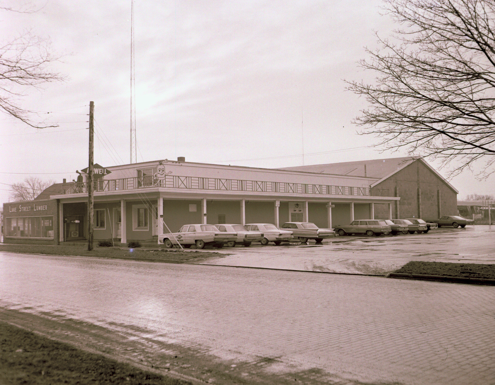 Black and white image of the front facade of Lake Street Lumber located at 1702 Lake Street in Kalamazoo, Michigan. The view is looking southeast with Lake Street running in the foreground. As of 2005 Lake Street Lumber is still operational.