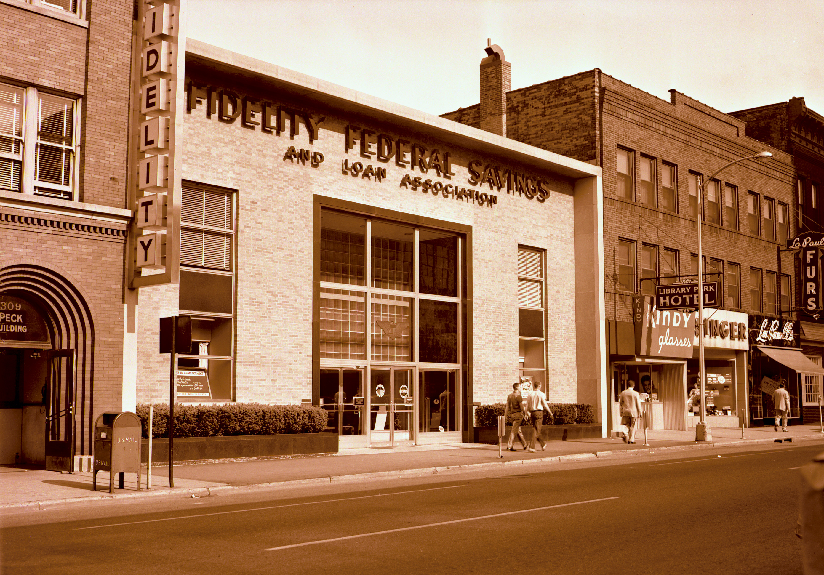 Black and white negative focusing on the Fidelity Federal Savings and Loan Association - Main Office located at 315-317 South Burdick Street in downtown Kalamazoo, Michigan. The image is looking southeast and includes (from left to right) the following businesses all of which stand on the east side of South Burdick Street. Peck Building-309, Fidelity Federal Savings and Loan Association-315 to 317, Library Park Hotel-321, Kindy Glasses-323, Singer-325, and LaPaulls Furs-327. This image was taken on May 22nd, 1959 and as of 2004 the buildings remain, however they have been extensively remodeled.