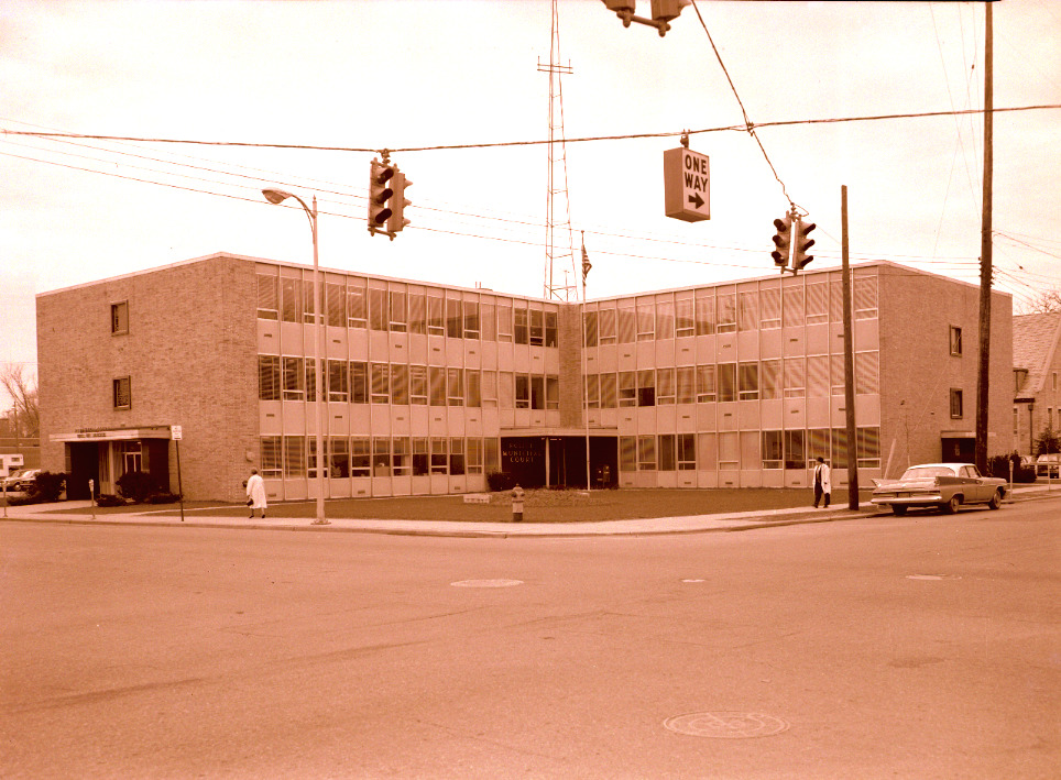 Black and white image showing the exterior facade of the Kalamazoo Police Department and Municipal Court Building located on the southwest corner of South Rose Street and West Lovell Avenue at 416 South Rose Street Kalamazoo, Michigan. The view is looking to the southwest. As of 2005 the Police Department and Municipal Court have moved to a new judicial complex with this structre is slated for demolition.
