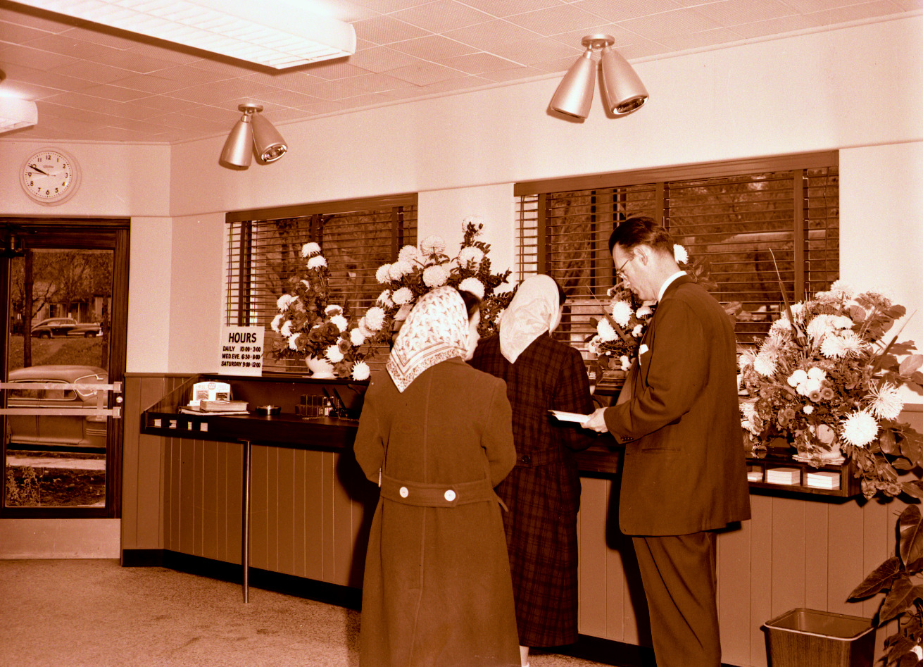 Black and white negative showing the interior of the Industrial State Bank located at 1018 West Michigan Avenue in Kalamazoo, Michigan. The image focuses on the service coutner which is covered with grand opening congratulatory flowers. As of 2005, this building remains standing however the tenants have since changed.