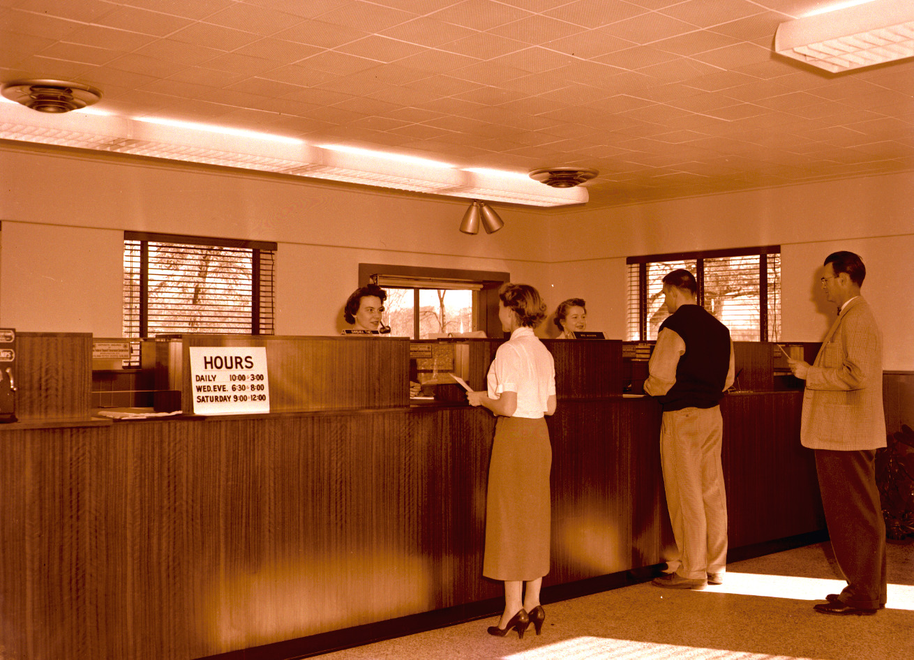 Black and white negative showing the interior of the Industrial State Bank located at 1018 West Michigan Avenue in Kalamazoo, Michigan. This image focuses on the teller windows with bank employees Ms. Thiel on the left and Mrs. Jackson on the right behind the counter. Unfortunately the names of the patrons waiting in line are unknown. As of 2005, this building remains standing, however the tenants have since changed.