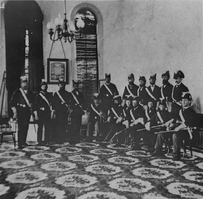 Photograph of Knights Templar officers in regalia, Lansing. Standing: Judge Chapman, Alfred Bixby, Geo Chandler, Ben Buck, Geo Grove, L.H. Briggs(?), F.B. Shrift, Dan Buck, John Tucker, Ben Davis(?), Col Barnard(?). Seated: Mr. Johns, Mr. Chamberlain(?), Alfred Beamer(?), H.D. Pugh, Ed Whitney, Mr. Wilcot(?), Dr. Shank. Photograph taken from a stereoptican view.