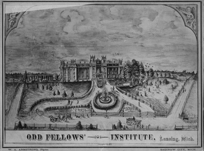 Photograph of an engraving of the Odd Fellows' Institute, Lansing. Various forms of recreation are depicted.