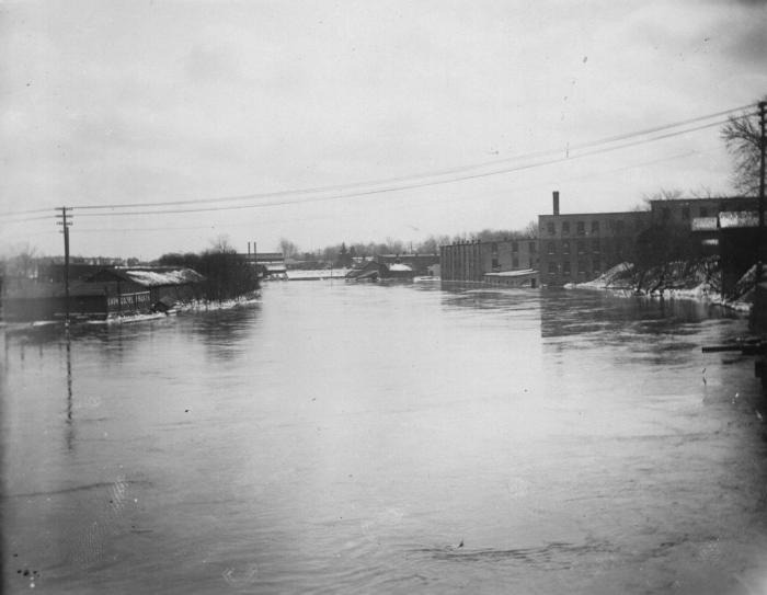 Photograph of factories partially submerged in flood March, 1904, Lansing, Michigan.