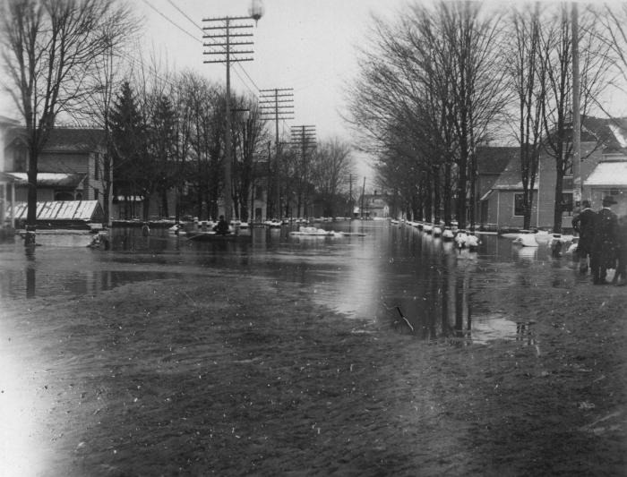 Photograph of a flooded residential area with a man in a boat and people observing in March, 1904, Lansing, Michigan.