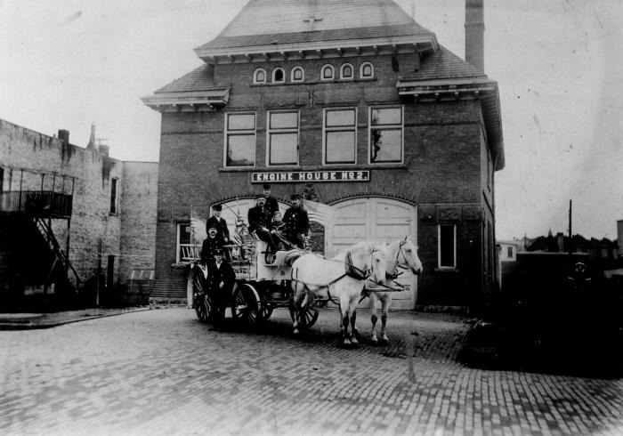 Photograph of horse-drawn Fire Engine Number 2 in front of Engine House No. 2, Lansing, Michigan.